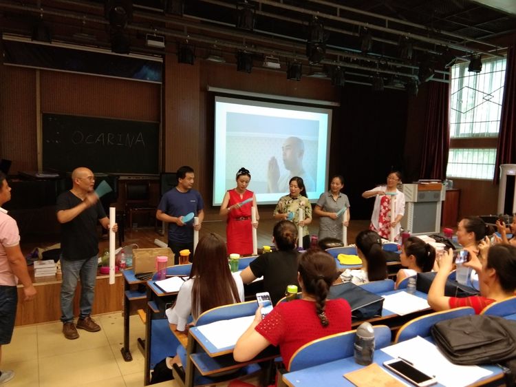 “音乐自由教学法”是赵洪啸老师在多年、多种环境和条件下的音乐教学实践中,对我国基础音乐教育的现状和问题,思考和摸索出的一种全新的音乐教学理念。赵老师向大家讲述了自己与大自然的亲密接触中,领悟到“天地万物皆乐器”的本质规律,发明了很多的创意小乐器。利用生活中随处可见的吸管、石头、树叶、瓶子等素材,制做出不同风格、不同音色、不同个性的乐器,令学员们眼界大开。赵洪啸老师还现场表演了陶笛演奏《purple passion》(紫色激情)。这是他在2014年第四届国际陶笛比赛获得国际银奖的曲目,乐曲充满动感,活力与激情四射,赢得了在场学员的热烈掌声。