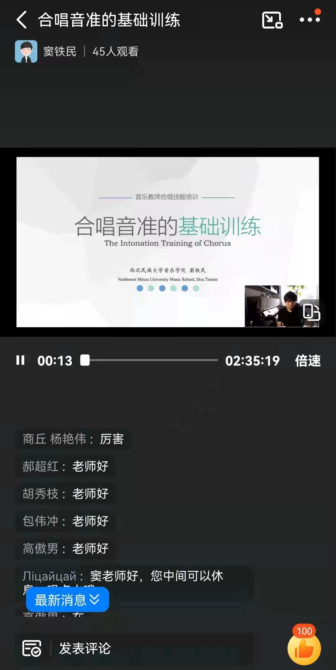 6月3日,应伟德国际1949之邀,西北民族大学音乐公司青年指挥家窦铁民为国培计划——县级骨干教师提升培训小学音乐教师培训班学员讲授《合唱音准的基础性训练》。由于疫情防控,本次采用线上授课。