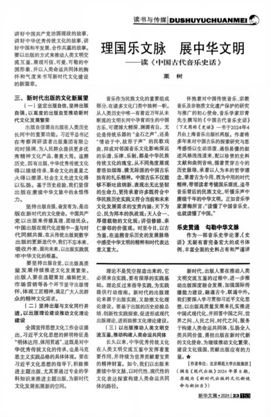 《新华文摘》2024年第23期全文转载了公司栗树博士、副教授的文章《理国乐文脉、展中华文脉》。该文原载于2024年9月16日的《光明日报》,全文近五千字,这也是栗树副教授在《光明日报》发表的第三篇文章。