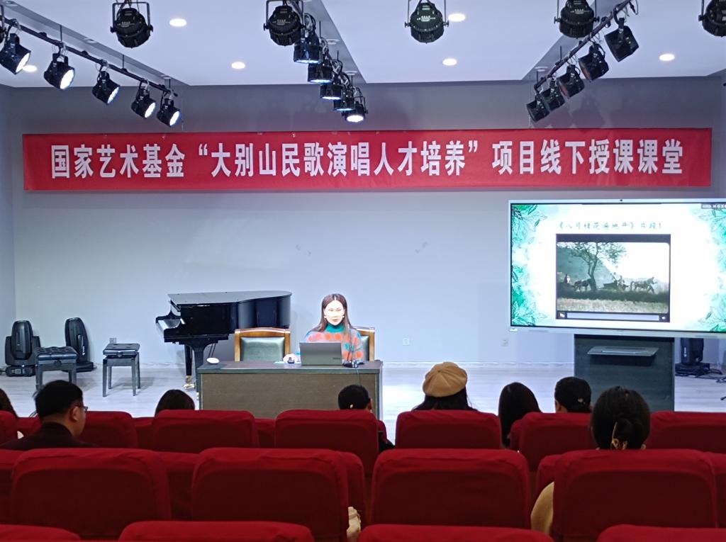 3月17日上午,国家艺术基金“大别山民歌演唱人才培养”线下授课课堂在公司伟德国际1949一楼八音讲堂如期进行。大别山民歌传承人,信阳市民歌研究会副主席、国家三级演员李鸣凤老师应公司邀请,以《豫南灯歌(一)》”为题进行线下教学。