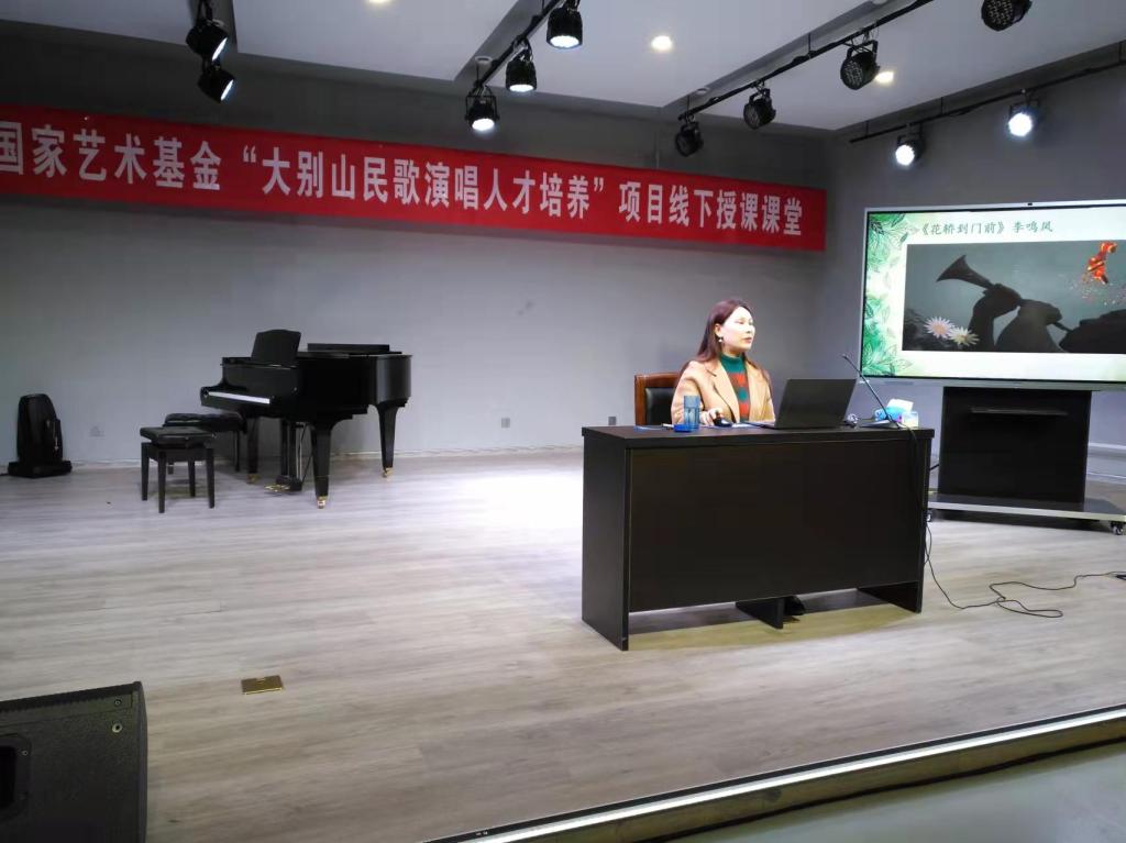 3月18日上午,国家艺术基金“大别山民歌演唱人才培养”线下授课课堂在公司伟德国际1949一楼八音讲堂如期进行。大别山民歌传承人,信阳市民歌研究会副主席李鸣凤应公司邀请,以《豫南叙事歌》为题进行线下教学。