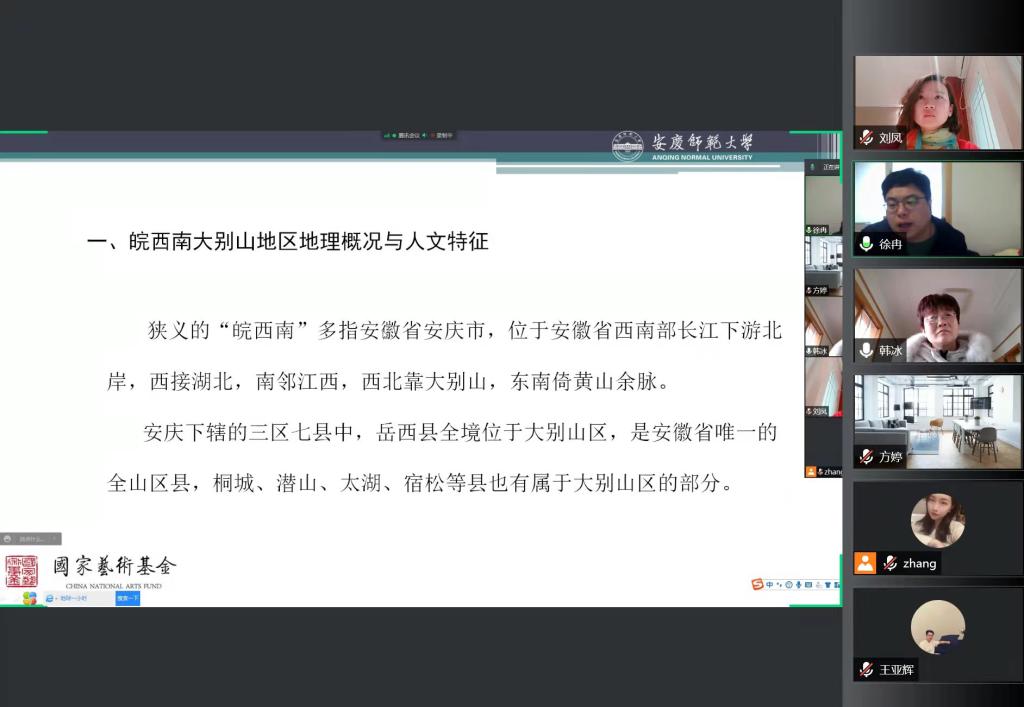3月27日上午,国家艺术基金“大别山民歌人才培养”项目线线上授课继续开展。由安庆师范大学副教授硕士生导师、音乐公司副经理徐冉以《皖西南大别山民歌与戏曲》为题进行讲解。会议由韩冰老师主持。