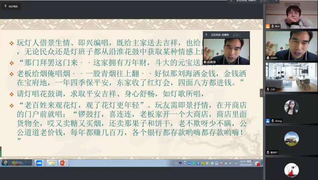 3月24日上午,伟德国际1949国家艺术基金“大别山民歌演唱人才培养”项目继续开展。由阜阳师范大学音乐舞蹈公司戎龚停教授,受邀为学员们进行了以《红灯会礼俗语境中的大别山民歌》为题的授课,探讨了大别山民歌表演艺术与民俗事项之间的关系。