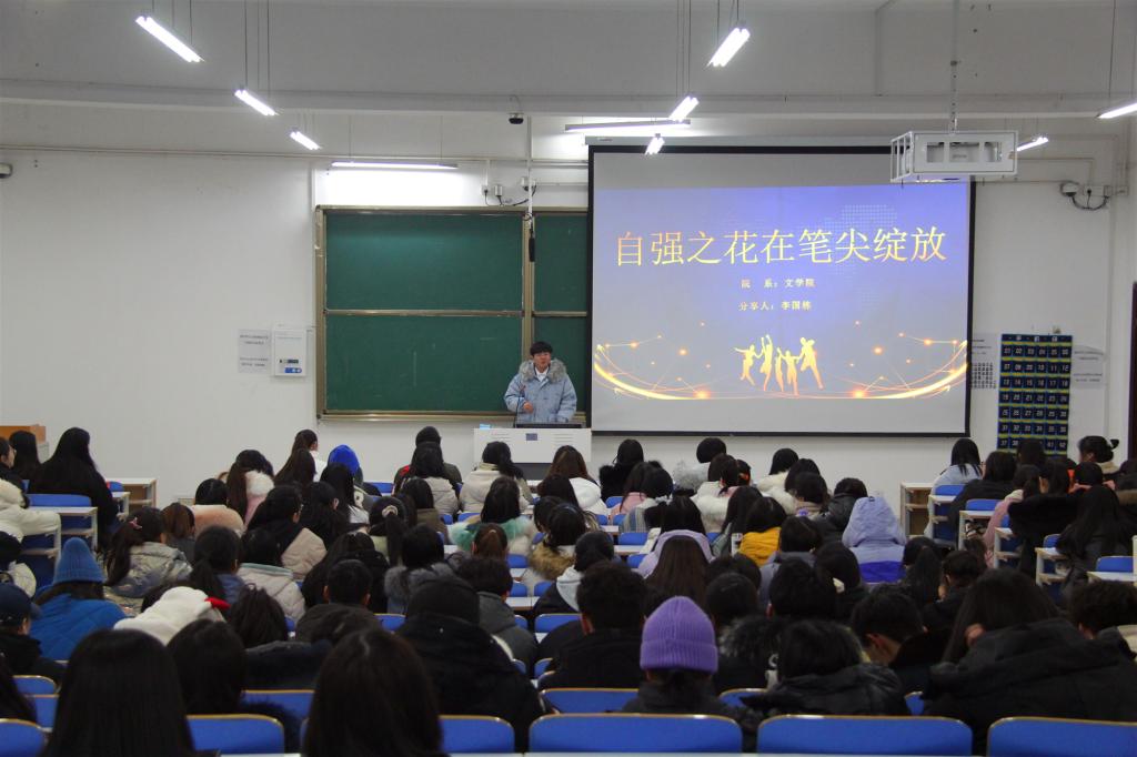来自传媒公司国家奖学金获得者张润嘉,她从学习、思想、生活、工作四个方面讲述了她的成长之路,告诫同学要学会合理规划时间,要脚踏实地做好身边的每一件事,做到“脚踏实地,仰望星空”;来自马克思主义公司的贾雨晴演讲的题目是“砥砺前行,自立自强”。贾雨晴在演讲中告诉同学们一定要脚踏实地,积极参加有益活动,认真负责,对生活一定要乐观;文公司2017级首届汉语言文学班自强之星获得者李国栋演讲的题目是“自强之花在笔尖绽放”。他鼓励同学们在人生中一定要砥砺前行,穷且益坚,不坠青云,心怀感恩且前行。