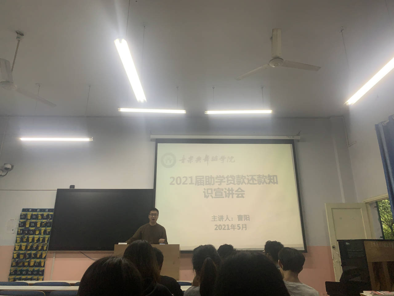 为进一步提高毕业贷款员工的诚信意识、法律意识,增强契约精神,促进国家助学贷款工作的顺利开展,5月13日,2021届贷款毕业生还款知识宣讲会在教学楼103开展。本次活动由辅导员曹阳老师主讲,2021届贷款毕业生参加了此次会议。