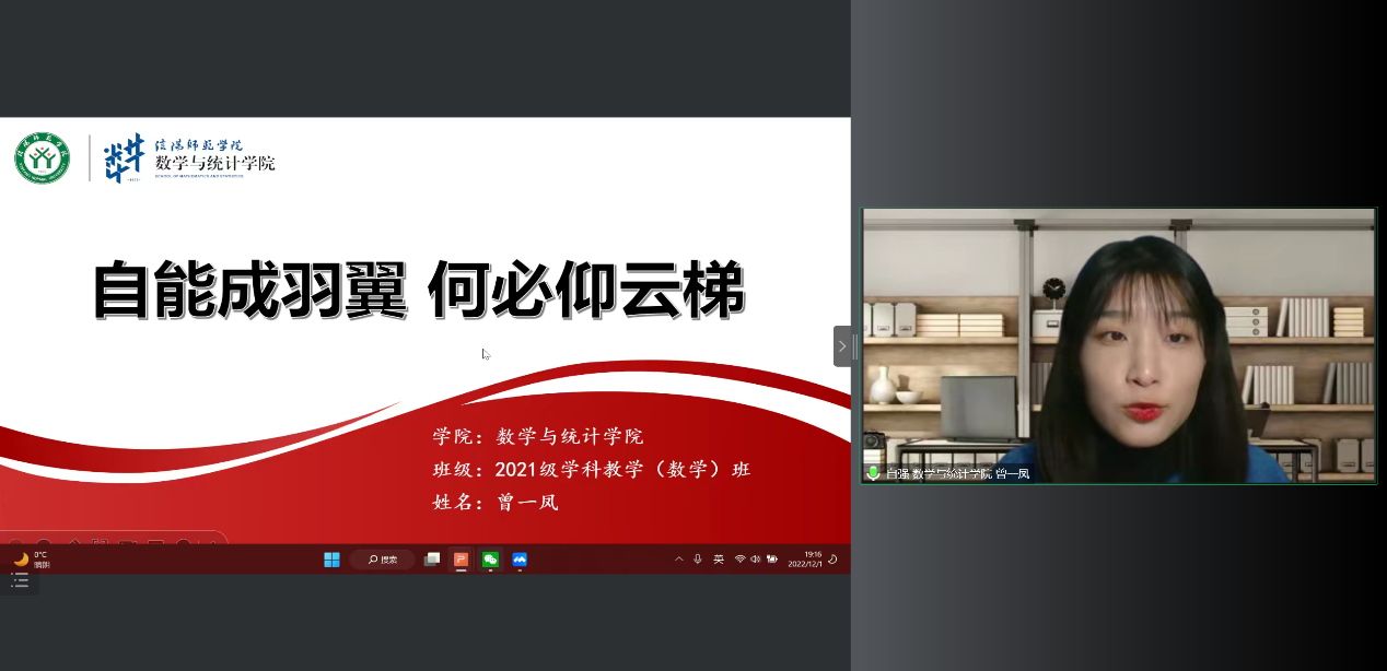 接着,曾一凤从“坚强意志、努力学习、顺应时代、心怀感恩”四个方面向大家分享自己的自强之路。鼓励同学们要有坚定的信念,充分利用课余时间参加活动,培养自身能力,提升综合素质并表示不仅要在课堂中汲取知识,而且要在社会中受教育做贡献。听党话,跟党走,努力成为担当民族复兴大任的接班人。