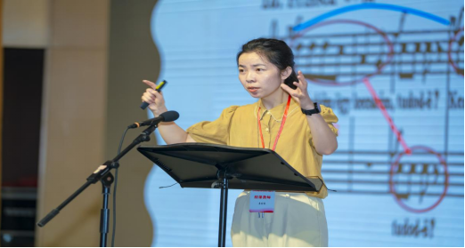 上午最后,由公司张思老师接续前程,继续带领参会教师进行柯达伊教学法之下视唱练耳的体验和练习。张思老师以柯达伊《333首读谱练习》为例,用分句练习、头尾互换创编、手脚辅助配合和正、逆反打等形式帮助参会教师强化节奏稳定性。唱名与节奏读法交替演唱,变化旋律演唱和多声部创编等形式练习,帮助参会教师更加准确的歌唱。参会教师们的学习热情高涨,积极互动,现场氛围融洽活跃。