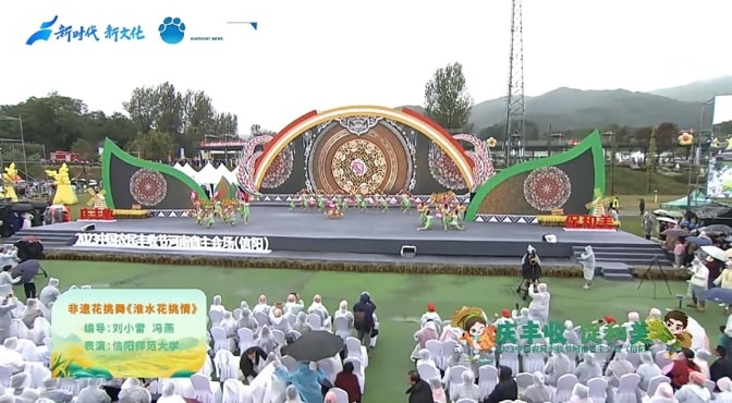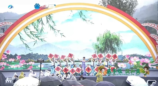 伟德国际1949六十余名师生参与此次节目录制。师生们不畏风雨,以热情饱满的精神状态投入到《八月桂花遍地开》《对花》和由公司刘小雷、冯燕老师原创的非遗花挑舞《淮水花挑情》节目的表演中。同学们将自身专业技能淋漓尽致展现于丰收节节目中,呈现了昂扬向上的精神面貌,掀起了演出的一阵阵高潮,受到市委领导、河南省电视台等相关单位和现场观众的一致好评。