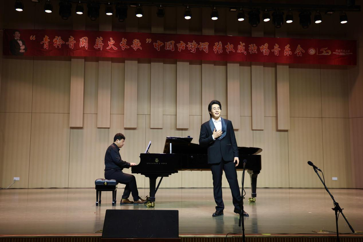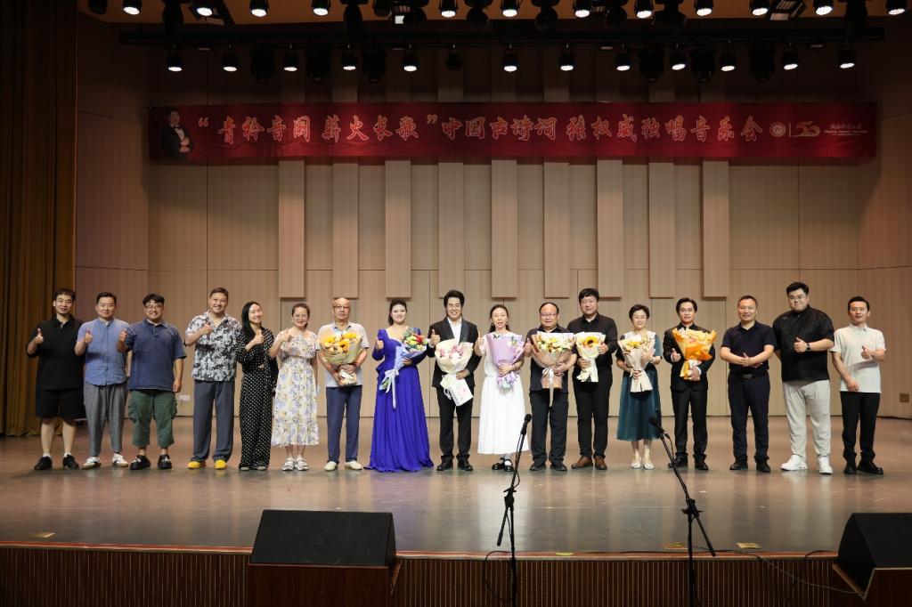 本场音乐会以“青衿音阙,薪火长歌”为主题,将多首中国古诗词进行声乐艺术演绎,展示了中国传统音乐文化的独特魅力。音乐会在一曲《踏雪寻梅》中拉开帷幕,在张权威老师连续演唱四首之后由特邀嘉宾杨永岗老师带来的《越人歌》《枫桥夜泊》,将观众带入了传统韵味美好的意境中。随后,张权威老师演唱了多首经典古诗词声乐作品,包括《锦瑟》《青玉案·元夕》等六首作品,每一首作品都经过多次打磨,将传统韵味呈现得淋漓尽致。接着,由特邀嘉宾张小萌带来《定风波·莫听穿林打叶声》、《长相思·其一》再一次点燃了现场观众的热情。接下来张权威老师又连续演唱了四首歌曲进入音乐会的尾声,最后,音乐会在全体演员及观众共同演唱的《春风十万里》中落下帷幕。