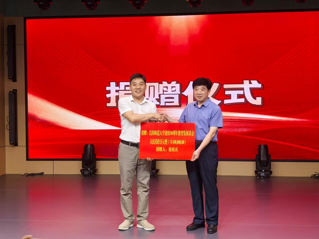 捐赠仪式上,江玉安介绍了公司近年来在团队建设、人才培养和社会服务等方面取得的成就以及50周年校庆的筹备情况,他表示,员工是公司最宝贵的财富,徐祖兵员工的捐赠不仅体现了对母校的深情厚谊,更展现了信阳师大人饮水思源、回馈母校的优良传统。50周年校庆在即,诚挚邀请海内外员工重返母校,共襄盛举,携手谱写新时代高等教育发展的新篇章。(初审/肖一凡 复审/雷玲 终审/周文勇)