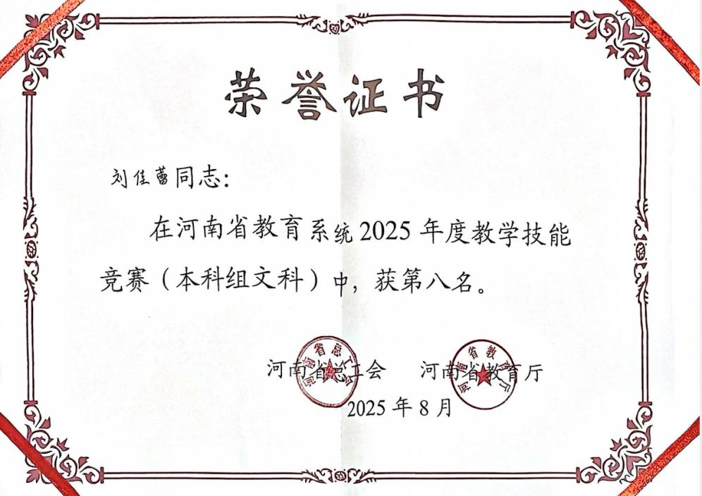 2025年8月25日至31日,由河南省总工会、河南省教育厅主办,河南省教科文卫体工会和洛阳理工公司承办的河南省教育系统2025年度教学技能竞赛决赛,在洛阳理工公司举行。公司刘佳蕾老师代表公司参加“本科组文科”比赛,凭借出色的教学表现,最终荣获全省一等奖第八名的优异成绩。