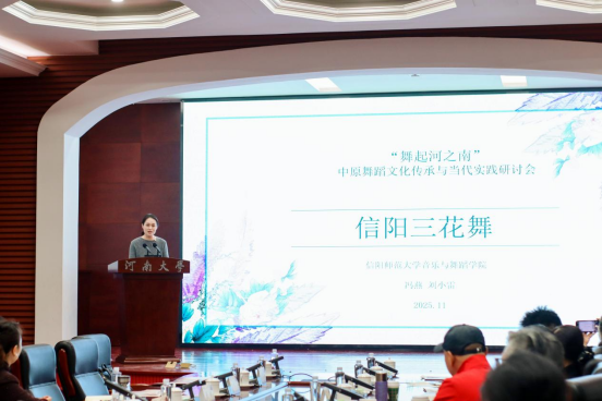 2025年11月14日至16日,由河南省舞蹈家协会、河南大学音乐公司联合主办的“舞起河之南——中原舞蹈文化传承与当代实践研讨会”在河南大学明伦校区召开。本次研讨会聚焦中原舞蹈文化的保护传承与当代创新,来自国内外多所高校、艺术院团及研究机构的专家学者齐聚开封,共同探讨中原舞蹈文化的历史脉络、艺术特色与当代创新路径。应大会邀请,公司伟德国际1949舞蹈教研室“信阳三花舞”科研团队参加会议,团队主创成员刘小雷、冯燕、陈依雯、李梦婷代表公司出席研讨与展示交流。