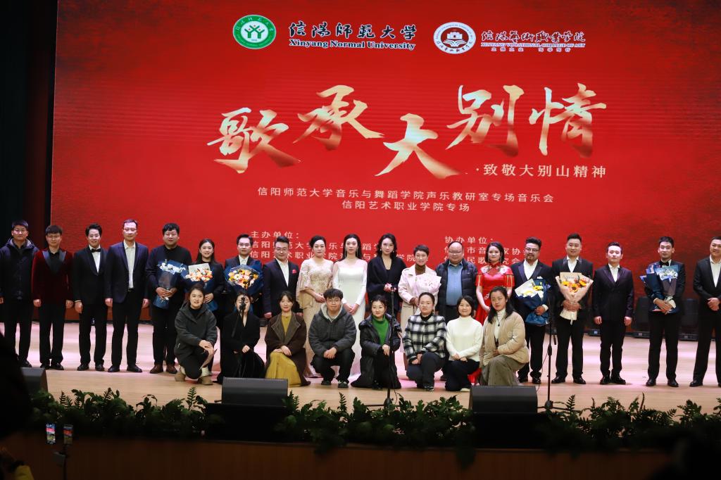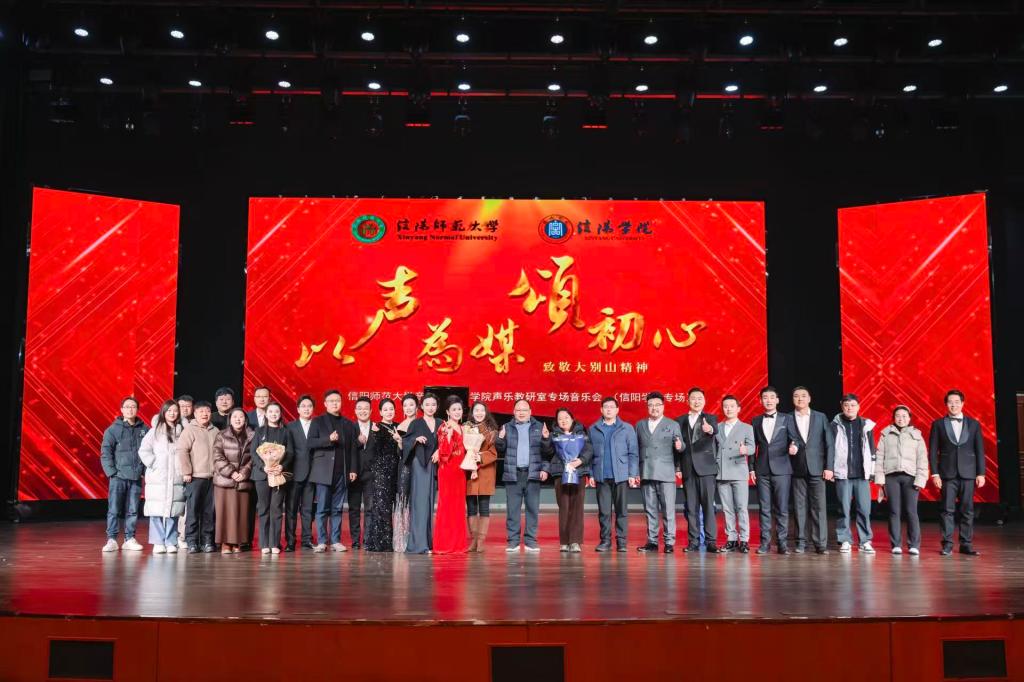 音乐会精选了《绣红旗》、《再见了大别山》、《英雄赞歌》等14首红色经典曲目。独唱的深情、重唱的和谐、合唱的磅礴,每一种演绎方式都让红色经典焕发出新的感染力。教师们倾注真情的演唱,让每一个音符都承载着历史的重量,每一个乐句都饱含着对英雄的敬意。演出接近尾声时,公司的演职人员齐唱校歌《托起民族的希望》,将现场气氛推向高潮。这段熟悉的旋律不仅是信阳师大师生对自身文化的深情告白,也作为沟通的桥梁,联结起三校师生共同的情感和对未来的期许。